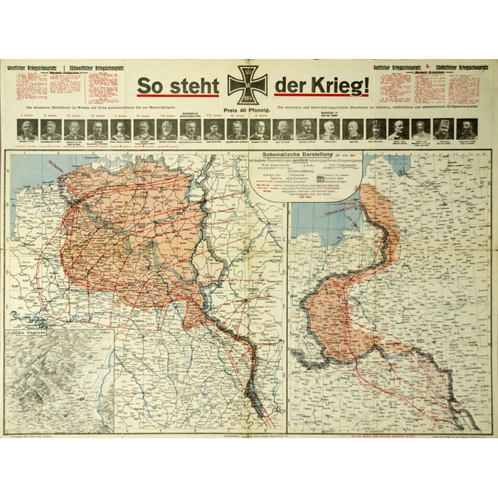 A German political war propaganda map showing the state of the German invasion as of July 1915. The front side shows a map of the Western front on the left and a map of the Eastern (Russian) front on the right. The backside has numerous other detail maps including one of the United Kingdom. The map self-folds to a postcard for mailing, with that portion also printed on the backside. Both sides incorporate photographic portraits of German military leaders.