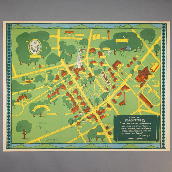 The top and bottom borders contain drawings of green mountains and blue sky; the left and right borders have a patterned design of green diamonds on a blue background. The dark green cartouche contains a quote from the college’s alma mater Men of Dartmouth by Richard Hovey (1864-1900) and a mileage scale. The quote reads: “‘For the men of Dartmouth who have the still North in their breath and the Granite of New Hampshire is made part of them ’till Death.’ — Hovey –.” The poet is praised in the 1951 issue of the The Dartmouth Alumni Magazine: