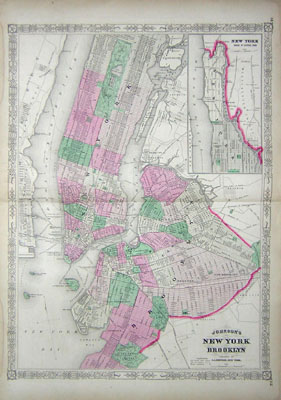 Detailed large map of Manhattan and Brooklyn set within an elaborate Victorian strapwork border. Parts of Jersey City, Hoboken, Weehawken and present-day Queens are also included. Governors Island, Ellis Island, Bedloes Island, the U.S. Cob Dock, Ward’s Island, Randel’s Island [sic] and Blackwells Island (later renamed Roosevelt Island) are also shown. Manhattan is shown from Battery Park to a few blocks above the North side of Central Park at 110th Street. An inset map in the upper right shows the rest of the island north of Central Park in a slightly smaller scale, with the present-day Bronx labeled “Westchester County.” Brooklyn appears prominently in the main map, shown from Greenpoint to the Greenwood Cemetery and from Red Hook to East New York Avenue. A heavy red outline separates Brooklyn from Flatbush and New Lots. The map shows parks, squares, streets, boat slips, ferry routes, railroads and “city car” (horse-drawn streetcar) routes. Wards are numbered and colored in shades of light and dark pink, yellow, and green. Footprints of some major buildings are also indicated, and institutional buildings on Blackwell’s Island are labeled, as are the major features of Central Park. This is the vertical version of the Johnson atlas New York City map. An earlier version, on a horizontal format, was published from 1862 to 1864.