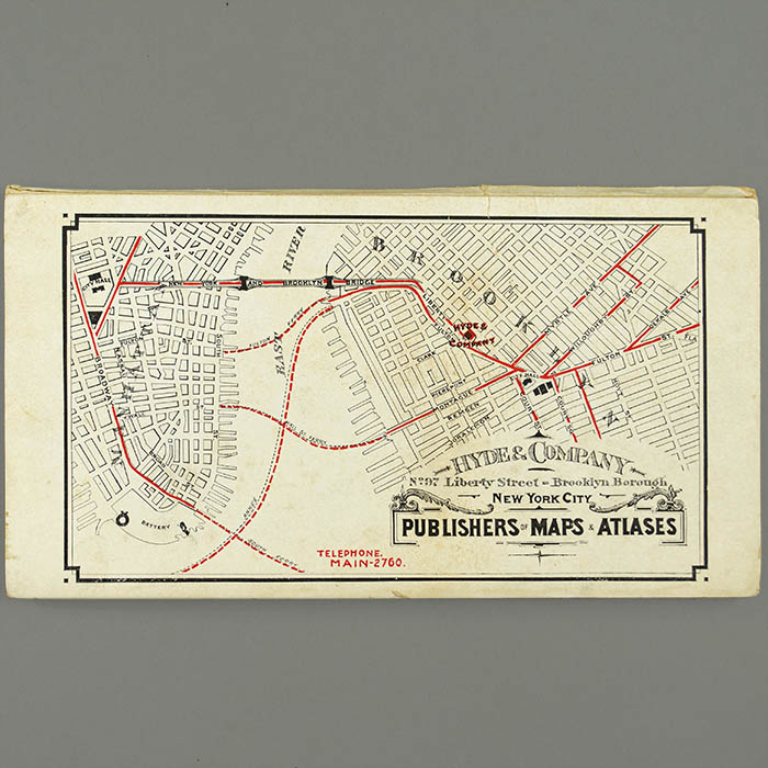 The map folds into pictorial stiff printed covers, as issued. When folded, the front cover has the title in Art Nouveau lettering superimposed over a simplified color map of the borough divided into numbered wards. The back cover has a black outline detail street map to show the location of Hyde & Company in Brooklyn. This map has ferry and rail lines from Lower Manhattan and other parts of Brooklyn in red, along with the address and telephone number. The inside front cover has “Price List of Maps and Atlases for 1900 Published by Hyde & Company.”