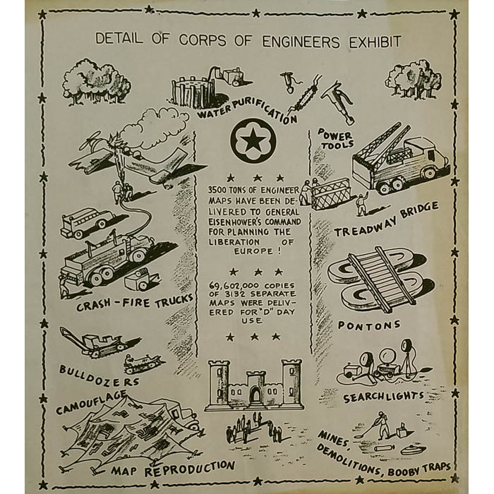 The cover bears the exhibit title and comic-book-style illustrations of midair explosions. The back page is illustrated with labeled pictures of the equipment presumably on display: water purification; power tools; a mobile treadway bridge; pontoons; searchlights; crash fire trucks; bulldozers; searchlights; mines, demolitions, and booby traps; and a truck beneath a tarp labeled “camouflage.” Hand-lettered text above a drawing of a European castle states, “3500 tons of engineer maps have been delivered to General Eisenhower’s command for planning the liberation of Europe! 69,602,000 copies of 3132 separate maps were delivered for ‘D’ Day use.” D-Day, a massive seaborne invasion, had begun on June 6 shortly before the exhibition opened and Allied forces were fighting their way across the Normandy countryside to rout the German Army. World War II ended almost a year later, in May 1945.