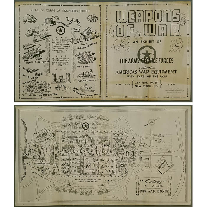 Billboard, then as now a publication covering popular entertainment, described the exhibition as one of three major events staged in New York City to promote the war effort, especially the sale of war bonds. A front page article describes displays of captured Nazi and Japanese weapons, uniforms, and equipment alongside American versions for comparison. “Besides equipment of all sorts — big guns, tanks, railway coaches and trucks — there are realistic working replicas of battle-area first aid stations, signal corps apparatus and engineering displays,” the article states. “Well-trained soldier-talkers on high pedestals describe the displays.” After being held over for an extra day in New York, the “Weapons of War” exhibition was restaged in Grant Park in Chicago.