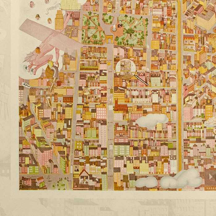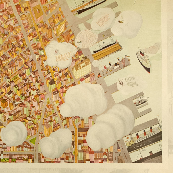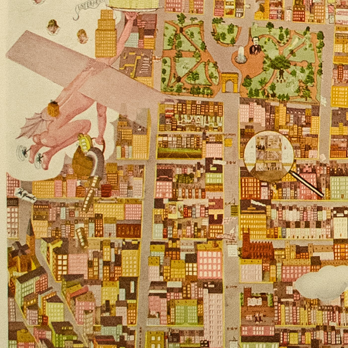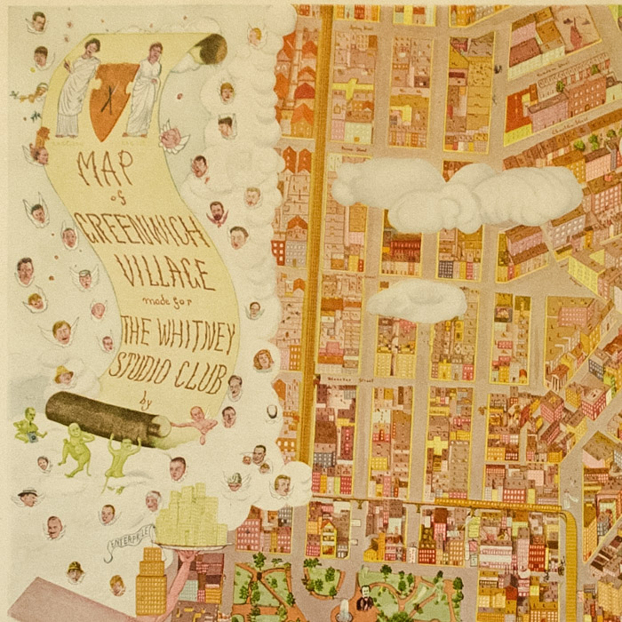 We reproduce a map of Greenwich Village by Kaj Klitgaard which was commissioned by The Whitney Studio Club and might be described both a neighborhood map and as a historical record of the Village that is passing before the inevitable march of apartment houses from the north and wholesale business from the south. Unlike so many pictorial maps, Mr. Klitgaard’s map is not too exclusively pictorial, not merely an object of wit and curiosity. The craftsmanship has been compared by an enthusiastic fellow artist of Mr Klitgaard’s to the delicate precision of the Persian miniaturist.