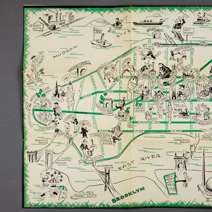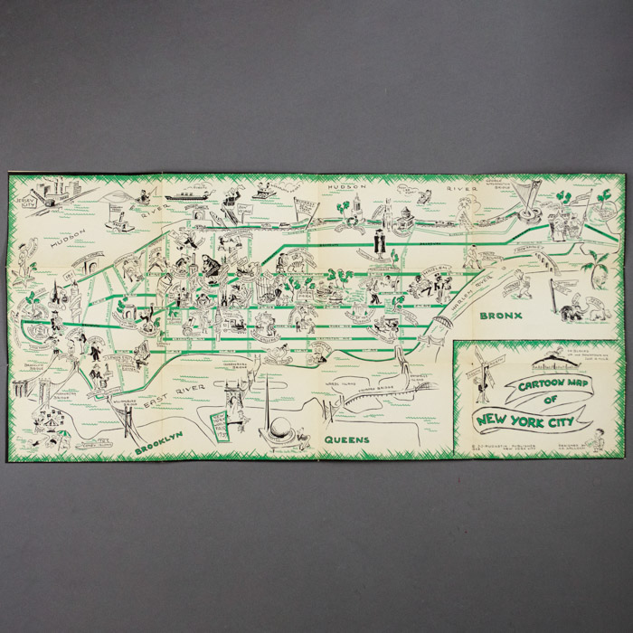 The map, printed in green and black, was issued folded in a pocket accompanying the book Cartoon Guide of New York City by Nils Hogner and Guy Scott. The book was the second volume published in the series Augustin’s Cartoon Guides of America, which as of 1938 included seven published and planned books. The guidebook itself is a straightforward and informative travel guide written in a breezy style, with small, cartoon illustrations.