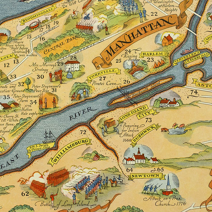Numerous early historic events and buildings are illustrated in small vignettes such as “Battle of Long Island,” “Clement C. Moore house where ‘Night Before Christmas’ was written,” “Nathan Hale Captured,” and “First L.I. Windmill 1804.” Overall the map is set within a geometric patterned border and decorated with a Mannerist style cartouche in the upper left and with a compass rose.