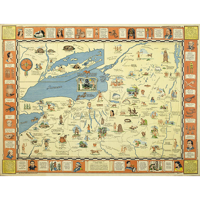 The map was published by the Rochester Museum of Arts and Sciences where the author, Arthur C. Parker, who had Seneca ancestry, was director, and the artist, Robert Gribbroek was the museum’s art director.