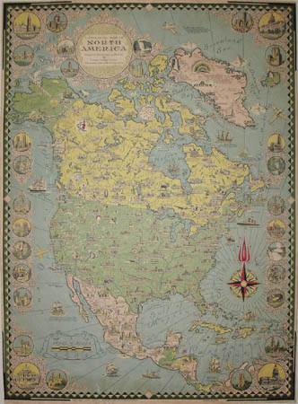 Ernest Dudley Chase was one of the most prolific and renowned pictorial map artists of the 20th century, producing about 50 maps published from the 1930s to the 1960s. Chase’s maps cover a broad range of geographical locations and varied topics including historical and current events, architecture, and technology. They typically incorporate large numbers of minutely rendered illustrations with explanatory captions that blend a scholarly approach with wit, patriotism, and optimism. As works of graphic art they are finely drawn and composed with a decorative flair. The biographical pamphlet A Meticulous Maker of Maps describes Chase’s “passion for perfection,” executing the detailed pictures under a magnifying glass “dot by dot, with tiny pens.”