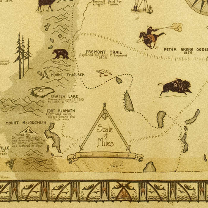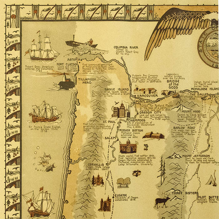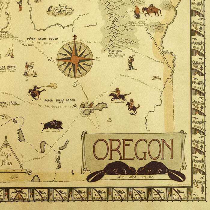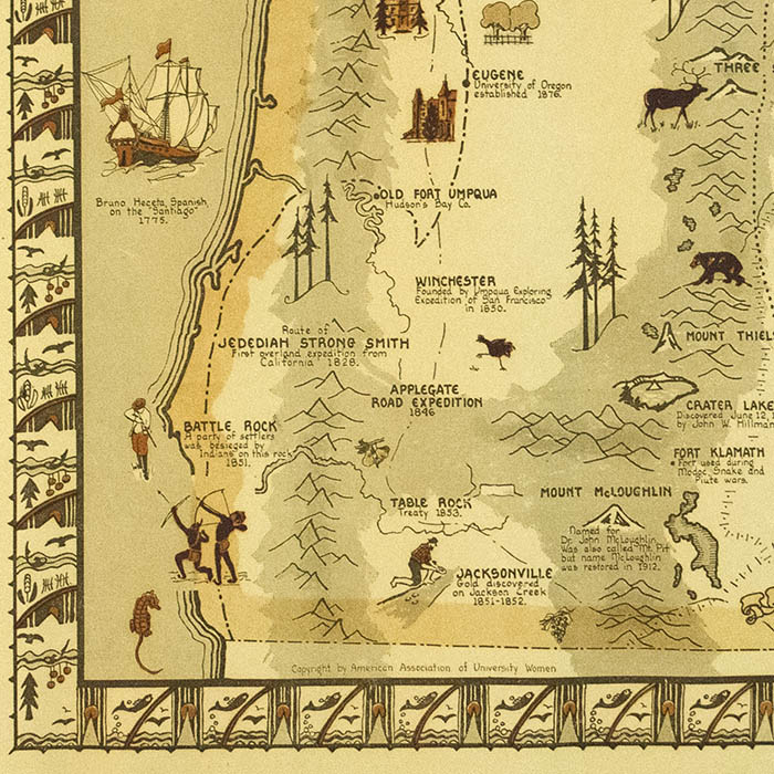 This map is apparently quite rare. The Oregon State University Libraries archives lists a copy of a map by Doris Wildman called Early Exploration of State of Oregon and dated 1929, but no image is available online. It may be this map or a related one. Indeed, the Art Deco stylizations of the illustrations and lettering of this map are consistent with that time period.