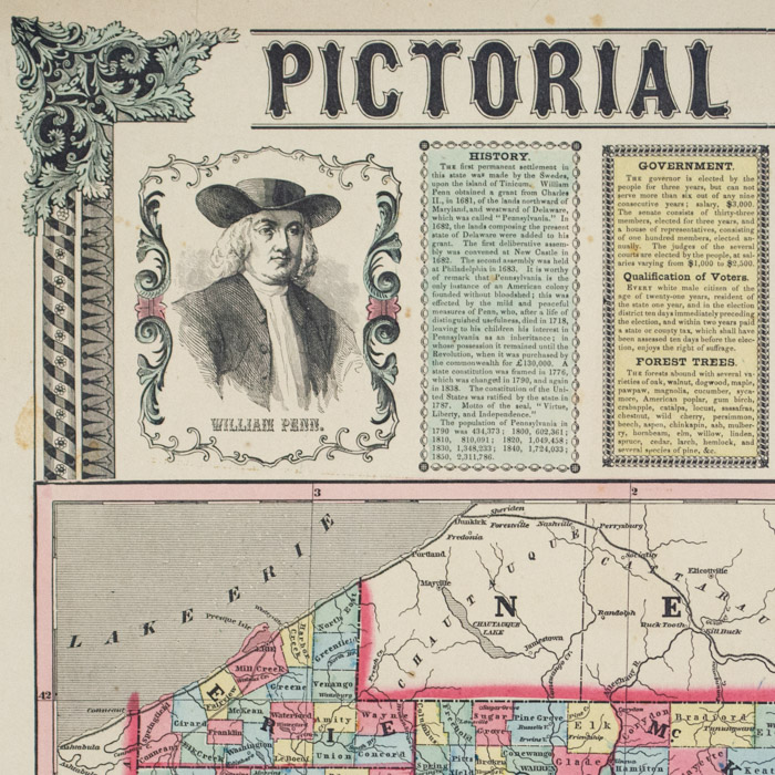 The Pennsylvania Coat of Arms is illustrated in the top center. In each of the four corners, respectively, are portraits of William Penn, Benjamin Franklin, Robert Morris, and Benjamin Rush. In the bottom are inset maps of Philadelphia and of Pittsburgh shaded in full color, as well as illustrations of Washington crossing the Delaware after the famous painting by Emmanuel Leutze, and of Independence Hall. The seven historical and statistical tables in the top and bottom portions of the map include History; Government, Qualifications of Voters, Forest Trees; Physical Aspect, Religious Denominations; Minerals; Population of Pennsylvania; Special Laws; Professions, Occupations, Nativities, Births, Marriages and Deaths; Public Schools; Academies and Other Schools.