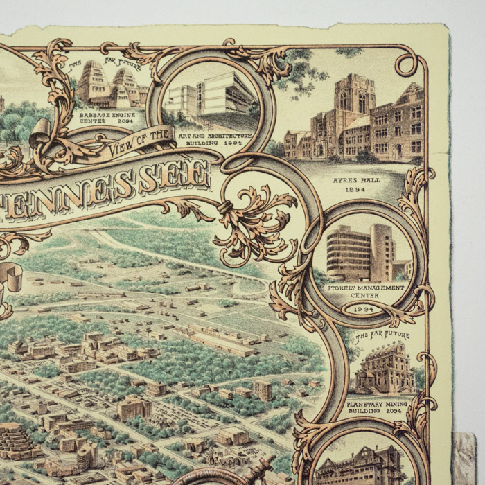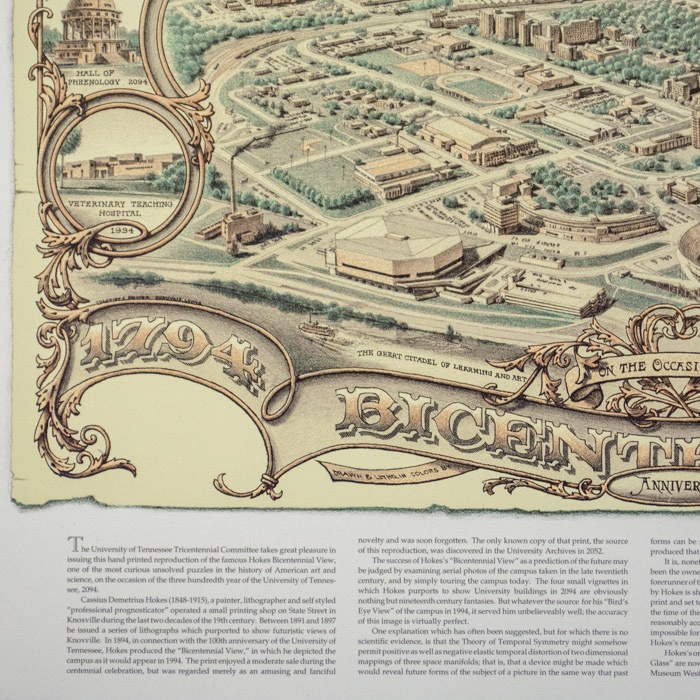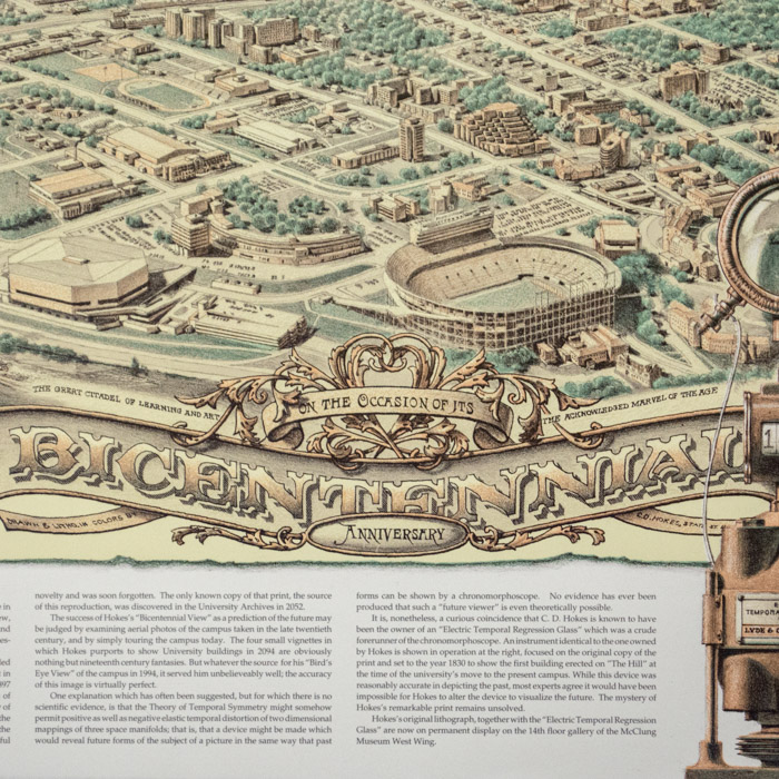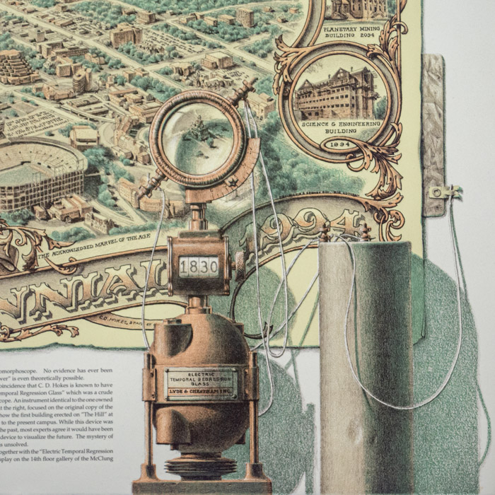 The concept and style of this lithograph derives from an ongoing series by one of its co-creators, Beauvais Lyons, a professor in the School of Art at the University of Tennessee Knoxville, including the creation of the fictitious Hokes Archives, of which this print is a part. Lyons is a printmaker and writer who has taught at the University of Tennessee Knoxville since 1985, where he has awarded the title of Chancellor’s Professor in 2011. He has had over 80 solo exhibitions at galleries and museums across the US. Lyons has also published articles on his work in a variety of scholarly and art journals. His work is in the collections of the Whitney Museum of American Art, the Smithsonian Museum of American Art, the Nelson-Atkins Museum, and the Philadelphia Museum of Art, among others. Among his awards are a Fulbright Fellowship to Poland in 2002.