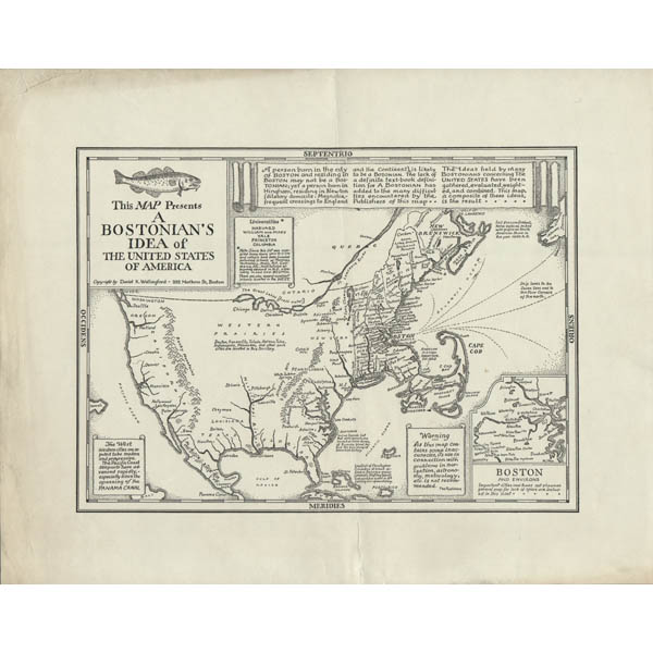 Bostonian’s Idea depicts the outsized importance of New England relative to the entire country. Indeed, the eastern half of Massachusetts, including Boston and Cape Cod, are drawn at even larger proportions. The importance of Cape Cod is also emphasized by the inclusion of an image of a codfish over the cartouche. The remainder of U.S. geography reflects the Bostonian’s lack of knowledge and interest in other parts of the country, with the Midwest a vast void labeled “Western Prairies” and “Texas,” and a few cities clustered around very small Great Lakes and Mississippi River. In the Midwest, Omaha, Denver, Reno and Houston are incongruously placed near the Pacific Coast lumped together into a generic American West dominated by California. The Mid Atlantic and South are also blank except for Florida and a few major cities with concentrations of affluent, high society families such as Philadelphia, Washington, Richmond and Palm Beach. An inset map of “Boston and Environs” shows various actual suburbs along with six variations on the prestigious address of “Newton,” and several satirical inscriptions that purport to explain this and other notions held by wealthy Bostonians. Other notes on the map also suggest that certain members of the social elite consider themselves as the only true Bostonians.
