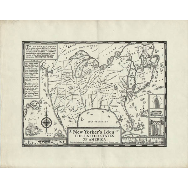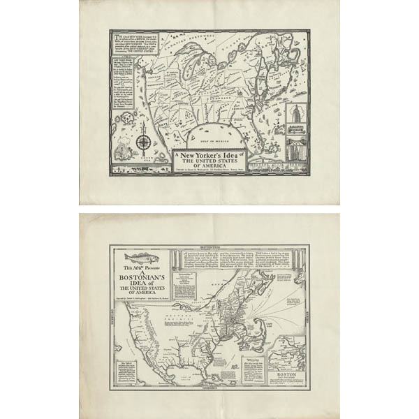 Daniel K. Wallingford created, copyrighted and sometimes self-published A New Yorker’s Idea of the United States of America, and This Map Presents a Bostonian’s Idea of the United States of America. Each of these two famous pictorial maps shows the United States from a humorous and satirical local perspective. The maps have been variously issued over an extended period of time, starting in the mid 1930s, in a complex publication and reissue history that is not yet fully known or documented. This is complicated by the fact that the maps rarely have a date imprinted on them.