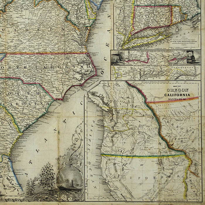 An inset map at the top shows rail and canal routes in Upstate New York between Albany and Buffalo. Other inset maps along the right side show New England and Northeast rail routes and the course of the Hudson River from New York City to Albany. The map captures the rapidly growing transportation network of roads, trains, and canals linking the East Coast with the Great Lakes region and other states east of the Mississippi. An inset “Map of Oregon, Northern California, Santa Fé &c.” reflects interest in these remote western regions among Americans. “California” includes current Nevada and Utah, “Oregon” includes the entire Pacific Northwest. These regions, the Upper Midwest, and areas west of the Mississippi are labeled with the names of the predominant Native American tribes.