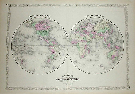 Alvin Jewett (A.J.) Johnson, the publisher, is best known for his atlases, issued in many editions in the second half of the 19th century, beginning with the publication of Johnson’s New Illustrated (Steel Plate) Family Atlas. Apparently Joseph H. Colton of the Colton family of cartographic publishers sold his atlas plates to Johnson in 1860: the title page credits Johnson and Joseph H. Colton with the supervision of the compilation, drawing and engraving, and is copyrighted by Johnson & Browning, “Successors to J.H. Colton and Company.” The plates were based upon maps from previous Colton publications, although the decorative borders are different. Later editions of the Family Atlas published in 1862 and 1863 are credited to Johnson and Ward, “successors to Johnson and Browning.” Editions continued to be published in New York until 1885.