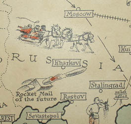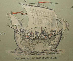 The latest Chase pictorial map — “The World United,” a pictorial history of transport and communications and paths to permanent peace–is likely to have a tremendous vogue as after-the-war developments take place. This map, as it indicates, is predicated on a world united — a smaller world than we have ever known, because distances have been annihilated by air travel. It demonstrates that we must, of necessity, live closer together because we are now, geographically, closer together. And in this pictorial presentation of this tremendous change in our daily lives and our future living, all thinking people will find much to study and evaluate. (p. 10)