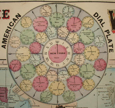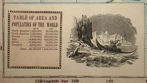 The pictorial illustrations include animals, scenery and people engaged in various activities, such as hunting and fishing. The world map is set within an elaborate decorative border showing members of different cultures in their characteristic dress. Each corner has a portrait of a man from a different continent set in a rectangular border, representing different races: Caucasian, “Mongul,” Malay and African. Two inset circular diagrams at the top center show clocks with the times in different cities relative to New York, one for world cities and one for American cities. The map was made prior to the standardization of world time zones, so the times are calculated to the minute. As a text box below the map title notes, “when it is Noon in New York it is 12 minutes past 12 at Boston…and 6 minutes past 7 at Honolulu, Sandwich Islands.” Another text box contains a table of area and population of the six inhabited continents. A small double hemisphere map is included in the center of the lower border.