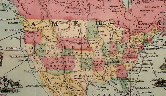 The map and surrounding illustrations (exclusive of the pictorial illustrations in the oceans) are hand-colored throughout in tints of red, orange, yellow, brown, blue and green. Map geography shows national boundaries with countries and U.S. states differentiated by color. Major cities, rivers and bodies of water, as well as islands in the ocean are labeled; major mountain ranges are shaded. In the continental United States, the area west of Mississippi differs from the present configuration of states. For example, Oklahoma is labeled “Indian Ter[ritor]y,” and various regions such as Nebraska, Utah, New Mexico, Washington and Oregon each include parts of what are now other western states.