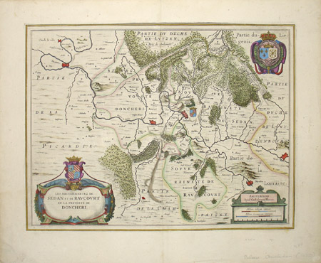 Blaeu’s maps from this series show mountains as raised topography, embellished with images of trees in bird’s-eye view clustered in wooded areas. The elaborate baroque cartouches are richly colored, generally incorporating the coat of arms of the region, and some decorated with more coats of arms. Additional cartouches show relative scales. Some maps have symbols identified in keys representing cities, burgs, villages, hamlets, chateaux, and abbeys; some are decorated with illustrations of people of the region. The outline colors vary. Some of the plates incorporate two or more maps on a single sheet.