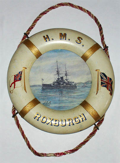Sailors have traditionally adopted crafts such as carving, rope work, whale bone scrimshaw and sailors’ shell valentines to pass the time on board ship or as a hobby after retirement. Sailor arts were often made as gifts for their wives or sweethearts back home, and also were sold or bartered by the sailors aboard ship or at port. Lifesaver-form frames were often made as souvenirs, framing photographs or paintings of the ship or its crew. It is possible that this lifesaver was made by a sailor or officer connected with the Roxburgh, but the quality of the painting suggests it was made by an artist for sale to naval personnel. The format and painting on the lifesaver are nonetheless typical of commemorative sailor folk art.