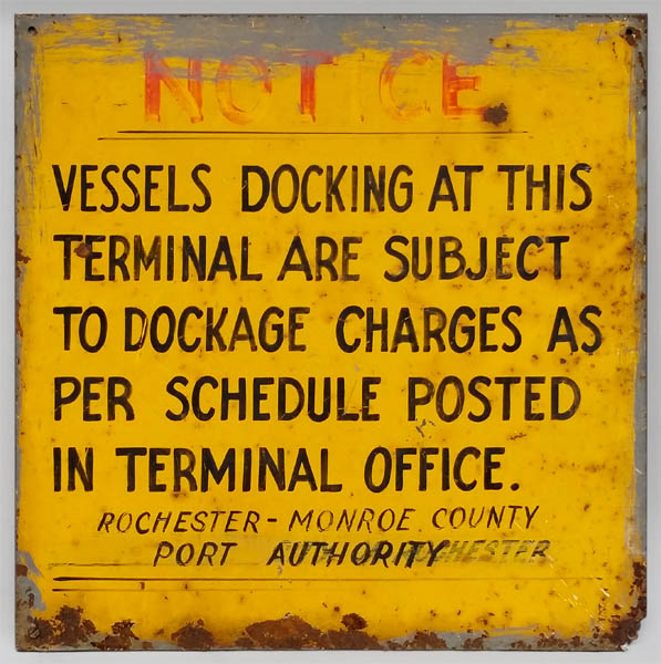 Inscription: NOTICE. VESSELS DOCKING AT THIS TERMINAL ARE SUBJECT TO DOCKAGE CHARGES AS PER SCHEDULE POSTED IN TERMINAL OFFICE. ROCHESTER — MONROE COUNTY PORT AUTHORITY.