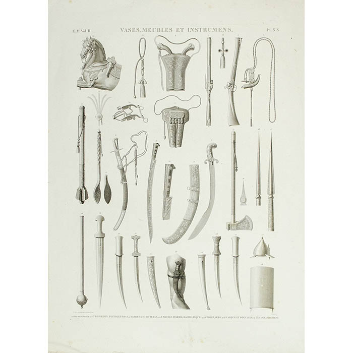Subtitle lower margin: Armes de Mamlouk. 1..5 Tromblon, Pistolets &c. 6..10 Sabres et Coutelas. 11..18 Masses d’Arme, Hache, Pique. 19..26 Poignards. 27..28 Casque et Bouclier. 29..33 Harnachement. [Mamlouk’s weapons. 1..5 Blunderbuss, Pistols & c. 6..10 Sabers and Cutlass. 11..18 Maces of Weapon, Ax, Pike. 19..26 Daggers. 27..28 Helmet and Shield. 29..33 Harness.]