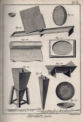 Remarkable reference book containing plates that accompanied Diderot’s “Encyclopedia,” a landmark work of the Enlightenment that depicted the tools and methods of artisans and tradespeople in a methodical and thorough way. This book shows the tools and manufacture of mirrors.