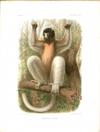 Lemurs are primates native only to Madagascar and make up most of the mammals depicted in the natural history portion of this work. Other sections of this work illustrated birds, mollusks, fish, butterflies and insects of Madagascar. John Gerrard Keulemans, an artist mainly known for his ornithological paintings, produced most of the bird illustrations for L’Histoire… and also contributed some of the illustrations of lemurs. Bocourt and Faguet, who did the rest of the lemur paintings shown here, were natural history artists whose works include botanical plates for other French works.