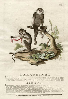 Il Talapoino è una Bertuccia di gentil sembiante e dal suo nome parrebbe che dovesse trovarfi a Siamo e nelle alter provincie della Asia Orientale piuttosto che en Affrica… Il Sifac ovvero Duc è l’ultimo della classe degli animali, che noi abbiamo chiamati Scimmie, Babbuini e Bertuccie, e non essendo precisamente di alcuno di questi tre generi, partecipa nondimeno di tutti…