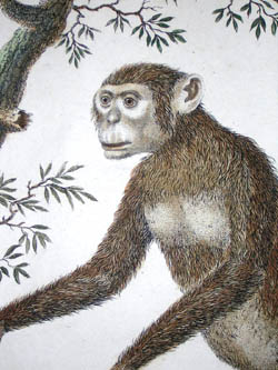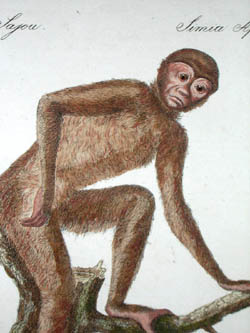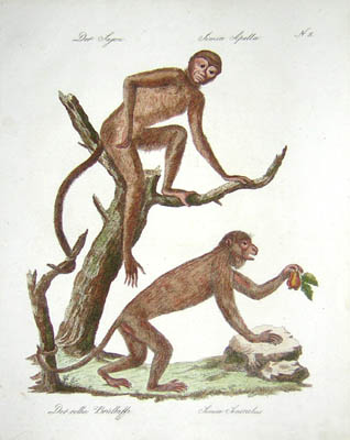 Natural history studies of monkeys and primates. As was typical of 18th and early 19th century natural history studies, the animals are generally shown on a patch of landscape against a white background, some perched upon small tree stumps. These prints highlight the climbing abilities of the monkeys, including the grasping capabilities of their tails and feet. Despite the attention to detail and scientific accuracy, there is an artificiality seen in other European studies of this era, in the slightly human manner of posing, and the anthropomorphic facial expressions.These plates come from a series on the animal kingdom, showing a wide variety of species, including elephants, rhinoceroses, lions, monkeys, horses, reptiles, butterflies and insects. Some plates also depict indigenous peoples. These are early examples of educational natural history books about the animal kingdom, a genre which remained popular throughout the 19th century. They are also early examples of lithographic printing, which had been introduced by German inventor Alois Senefelder in the 1790s.