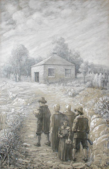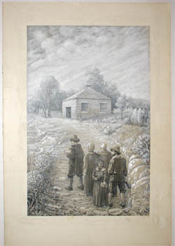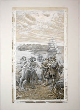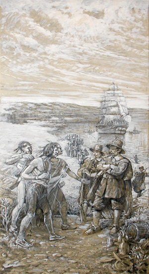 The murals show the Bronx as early as 1639, when Jonas Bronck (d. 1643), a Scandinavian-born immigrant from Holland took advantage of an opportunity offered by the Dutch West India Company and staked a claim on about 500 acres of land across the river from Manhattan Island. He brought his wife, servants and livestock from Holland, and following the Dutch practice of clearing title to the land, purchased it from two Native American sachems (Algonquian chiefs), as depicted in Jonas Bronck Buying the Land from the Indians. Bronck built a stone house overlooking the confluence of the Harlem and East Rivers, depicted in Erecting the First Stone House. Though he only lived there for four years, his name became attached to his farm and the river that ran through it, which was called Bronck’s River (now the Bronx River). This was eventually abbreviated to Bronx and became the name of the surrounding land as well. Another mural of early Bronx history in the series is Early Settlers Gathering at the First Community House. The fourth mural of The King’s Bridge, shown in The Original Bridge Connecting the Bronx with Manhattan, is related to slightly later Bronx history. Built by a British lord in 1693 to span a creek that has since been filled in, the bridge was part of the Boston Post Road and connected what is known today as the Kingsbridge section of the Bronx with Marble Hill, which is part of the borough of Manhattan.