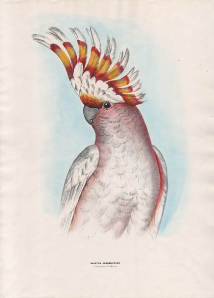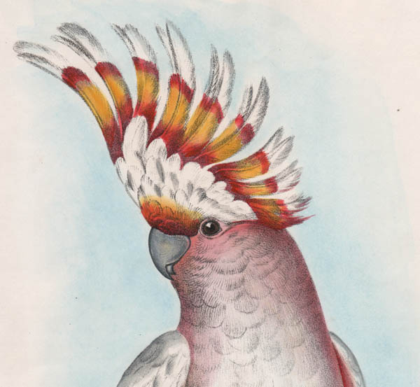Natural history study of a female Leadbeater’s Cockatoo, an exotic, colorful Australian tropical bird. Posed almost like a portrait with the head tilted at an angle and looking back at the viewer, the depiction shows only the head and shoulders to mid breast. This emphasizes the bird’s most striking feature — its tall crest with scarlet, yellow and white feathers. Diggles intended for the prints in Companion to Gould’s Handbook — illustrating about 240 Australian birds — to be a more affordable alternative to competitor John Gould’s Birds of Australia. Indeed, most of the bird specimens Diggles depicted were from the collections of Gould’s brother-in-law, Charles Coxen, and Eli Waler of Brisbane.