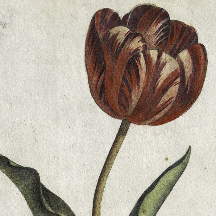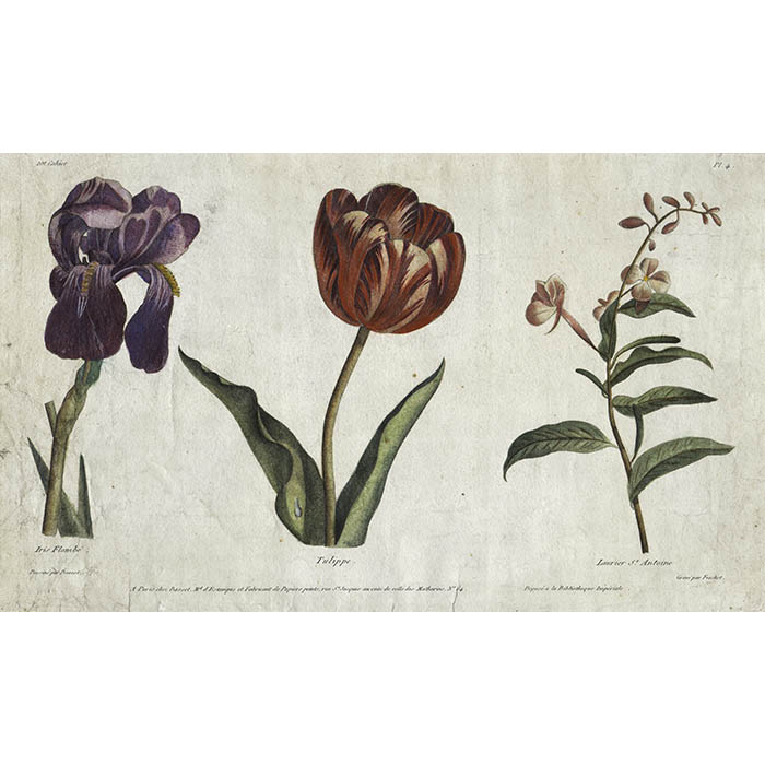 Jean Louis Prévost was a painter of landscapes and flowers; and frequently worked in watercolor. Born in Nointel, France, he was a student of Nicolas Bachelier and a member of a circle of painters associated with the great botanical artist Gerrit van Spaendonck. He was a member of the Academy of Saint-Luc, exhibiting paintings of flowers and fruits there from 1791 to 1810, and he also exhibited at the Academie Royale. His works are in the collection of a number of French museums. His best known work is the Collection des Fleurs et des Fruits (Vilquin, Paris: 1805). Prévost botanical prints in similar size and style were published “chez Basset,” Rue St. Jacques in the early 19th century. In addition, in the same period, a series of Cahiers de Fleurs dessineés d’aprés Nature after Prévost and engraved by A. Legrand was issued. Prints based on paintings by Prévost were separately issued as well, in the late 18th and early 19th centuries, some bound in composite sets of prints by various makers.