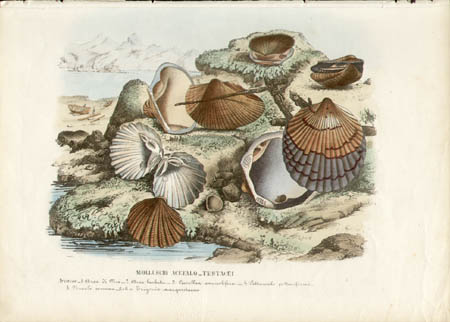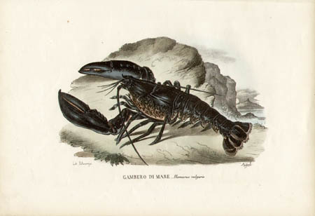 Marine prints from a set of Italian natural history prints of birds, mammals, monkeys, fish, shells, reptiles, amphibians and insects in their natural environments. The landscape settings are simple yet effective compositions that convey general information about each creature’s habitat. Although European species are well-represented, the plates also portray animals from distant continents then considered exotic curiosities. The prints are from a Neapolitan zoological atlas, which, as its name suggests, was a compilation of works published in Italy and other countries. Some of the sources of the prints are easily recognizable, such as the osprey, strikingly similar in composition to John James Audubon’s early 19th century study. Many of the mammals, particularly the monkeys, are whimsically depicted with human personalities, as was typical for Italian natural history works of that era. This diverse work also includes several ethnographic subjects.