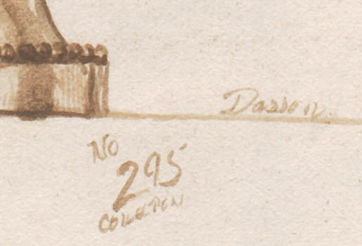 Condition: Generally very good with the usual light wear, toning, soft creases. Some overall faint scattered foxing. The drawing was made on the back of an etching dated 1853 after François Gerard’s portrait of Madame Regnault de Saint Jean Dangely (1798). It is signed lower right “Dasson.” The signature has reasonable similarities to the standard stamp found on extant signed pieces of Dasson gilt bronze decorative arts, and presumably is by Dasson himself, though possibly alternatively by a designer in his workshop.