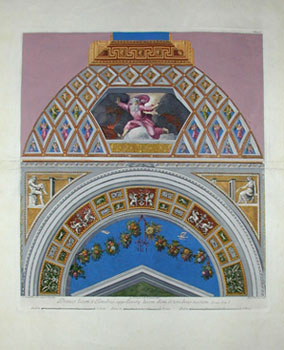 The prints in this set are based on renderings by the painter Gaetano Savorelli and the draughtsman Ludovico Teseo. Pietro Camporesi (1726-1781), a Roman architect worked for Pope Clemens XIII and Pius VI in the 18th Century on rooms for the Vatican Museum, and contributed to designs in Loggia di Rafaele nel Vaticano, particularly its frontispiece. The prints were etched and engraved by Giovanni Ottaviani and Giovanni Volpato (1740-1803). These artists took some liberties in borrowing elements from Raphael’s Vatican tapestries to fill in elements that were illegible in the original frescoes due to deterioration over time. Thus, the prints are amalgam of actual and supposed design elements of Raphael.