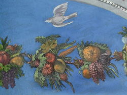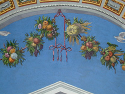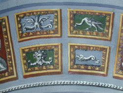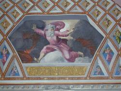 In the image, God is personified in a hexagonal frame at the top of the fresco as a gray-bearded man in flowing red robes, dramatically pushing apart fiery clouds of darkness as light shines through the opening created by his action. The hexagon is set within a semi-circular Gothic architectural structure, divided into diamond-shaped and triangular windows; within each is a winged angel. Below this vault is the arch. It incorporates a garland against a “fresco blue” field and grisaille figures and emblems, most prominently a pair of winged beasts flanking a caduceus in the center. The rectangular reserves in the spandrels illustrate two seated figures — a semi-nude male in the upper left, and a draped female on the right, blowing a horn.