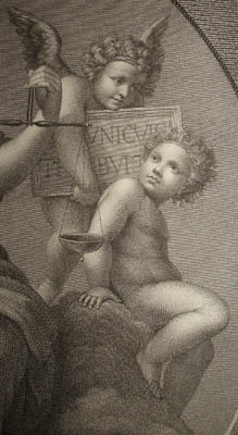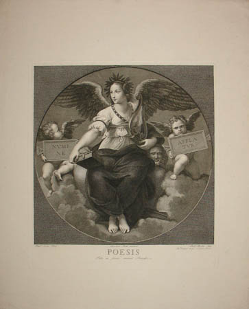 Among the more famous prints after Raphael are series from the late 18th century illustrating his frescoes in the Vatican stanze (notably Picturae Raphaelis Sanctii Urbinatis,Rome: 1722); the Vatican loggia (notably Loggia di Rafaele nel Vaticano, Rome: 1772-77) and the Villa Farnesina in Rome (notably Psyches et Amoris Nuptiae ac Fabula, Rome: 1693). One popular set, variously issued as engravings and lithographs during the 19th century, shows details of Raphael’s allegorical frescoes of 12 hours of the day and night. A related set of engravings depicts the gods and goddesses of the Roman pantheon riding in chariots in their heavenly domain, probably representing the seven days of the week.