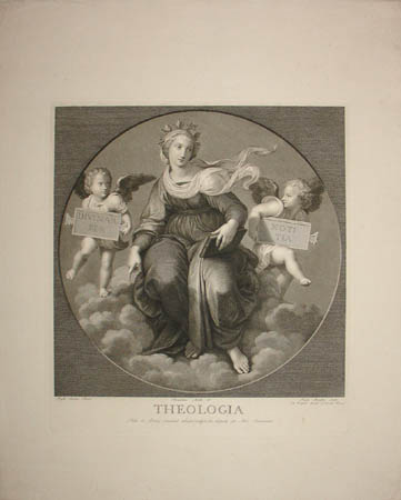Set of allegorical prints after famous frescoes by Raphael depicting female personifications of Justice, Philosophy, Poetry, and Theology, seated in the clouds with putti and attributes of their disciplines. The frescoes, considered among Raphael’s greatest achievements, were commissioned in 1509 by Pope Julius II as part of the decoration of the Stanza della Segnatura, one of the four stanze, or rooms, in the Vatican apartments. This room was meant to serve as Julius’s private library, and the decorations encompass the major pillars of human knowledge. The four personifications are painted in tondos (circles) on the vaulted ceiling, and between them and below them on the walls are frescoes related to the areas of knowledge they represent. The titles of each print make reference to the major wall paintings beneath each tondo. The room as a whole combines references to antiquity, the Bible, and contemporary theology, suggesting an ultimate unity of knowledge descending from God, symbolized in the center of the ceiling by an octagon displaying the Papal arms. The prints were published by Giovanni Volpato (1740-1803), who also was one of the engravers of a set of prints after Raphael’s frescoes, Loggia di Rafaele nel Vaticano (1772-77).