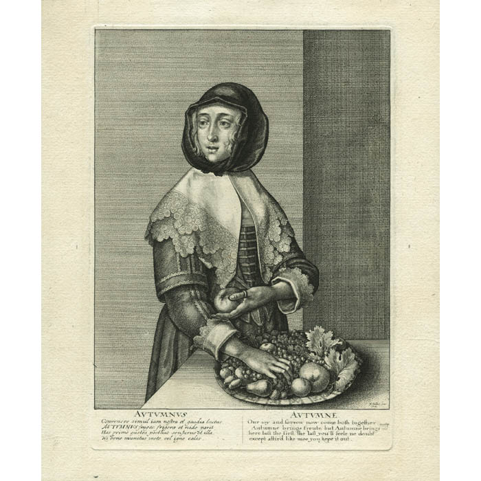 Inscriptions in English and Latin: “AUTUMNE Our ioy and sorrow now come both together/ Autumne brings freute, but Autumne brings cold weather/ here tast the first, the last you’ll feele no doubt/ except attir’d like mee you kepe it out. AUTUMNUS Convenere simul iam nostra et gaudia luctus, […] Ni bene munitus veste, vel igne cales.”