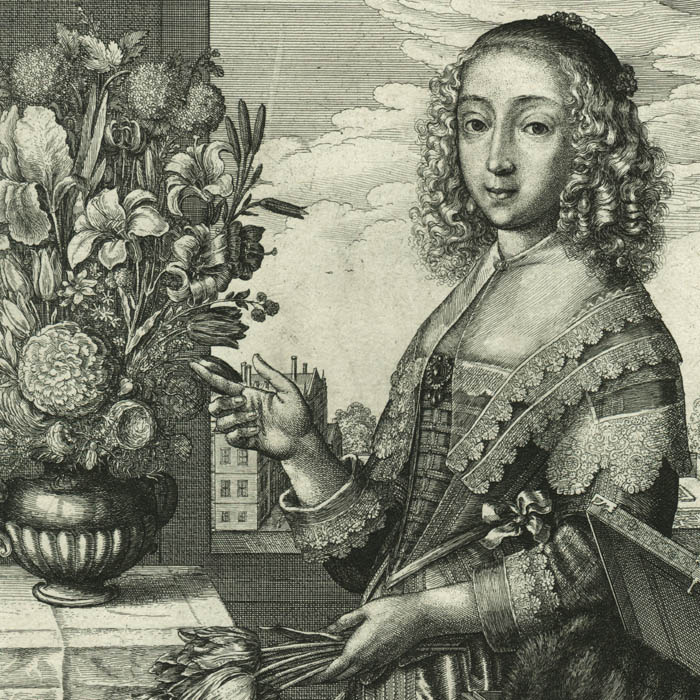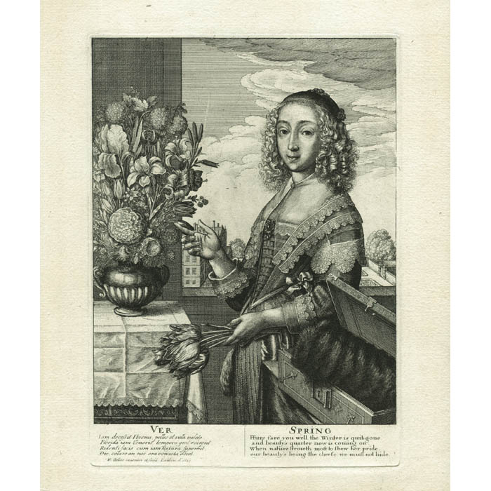 I. Spring is represented by a woman holding tulips gesturing toward a table covered with a lace-trimmed cloth, on which there is a vase holding a lush bouquet of lilies, irises, carnations, and tulips. At her right is an open chest, in which she has put away her furs, as is referenced in the verse below. In the background is a garden view which the British Museum says was presumably one of the residences of the Earl of Arundel, one of Hollar’s patrons.