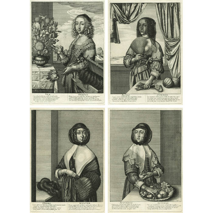 Allegorical works of art of the four seasons have long been a popular genre; nonetheless, according to Czech National Gallery curator Alena Volrábová, Hollar’s approach in this 17th century set was very original in his use of contemporary urban women dressed in seasonal garments. She also observes that Hollar showcases his masterful printmaking technique technique in depicting different textures in the etching medium, such as lace and fur. Between 1641 and 1644, Hollar made at least three such sets — with different figures of women and verses — the three quarter length allegories being the first set of this series. Following scholar Richard Pennington’s catalogue raisonee of Hollar’s etched works, the prints in the offered set all appear to be State ii, except for Spring, which is State iv.