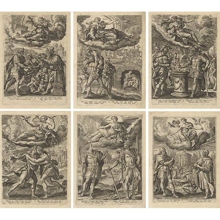 A numbered set of seven allegorical prints of the Virtues. Each print features a female Roman goddess shown in the clouds personifying her trait above a scene from Roman history that illustrates it. They are fine examples of the popular trend of personified allegorical prints by Dutch artists made for Dutch aristocrats in the second half of the 16th century. Examples of four of the seven offered prints are in the collection of the Metropolitan Museum of Art, which attributes the images to artist Maerten de Vos, published in Antwerp in 1581. Scholar Geoffrey Shamos, in his Ph.D thesis writes extensively about prints of this period, including numerous sets by de Vos. He states that this set was published by the renowned map publisher Gerhard de Jode (1509–1591) in about 1585 together with a preliminary illustrated title page (not present with the above offered seven prints) with the words Virtuti Fortuna Cedit (i.e., fortune yields to virtue). Nonetheless, the name of Gerhard de Jode’s son, Pieter de Jode the Elder (1570-1634) appears on Plate 1 as “execud” indicating that he was the printer or publisher, though we note he would have been a teenager in the 1580s. Shamos references various attributions by other scholars of the set to de Vos but does not himself adopt that attribution per se.  He states that the etcher is unknown, but suggests in a footnote that the set possibly was engraved by the Collaert family of engravers — specifically Adriaen Collaert or one of his elders. In summary, the attributions of this set as to artist, etcher, title, and date are at present subject to educated speculation. In any case, as a complete sequential numbered set of seven, these prints are very rare.