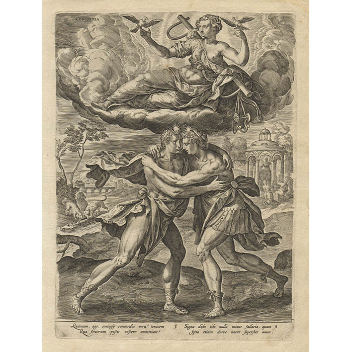 With doves resting on her fingers, [in Concordia, Plate 5], Concord appears above the twins Castor and Pollux. The Dioscuri appear in the moments following Castor’s fatal wounding at the hands of Idas, when Pollux decides to share his brother’s fate so that they can remain together. The stars on their brows indicate their celestial transformation into Gemini following their deaths.