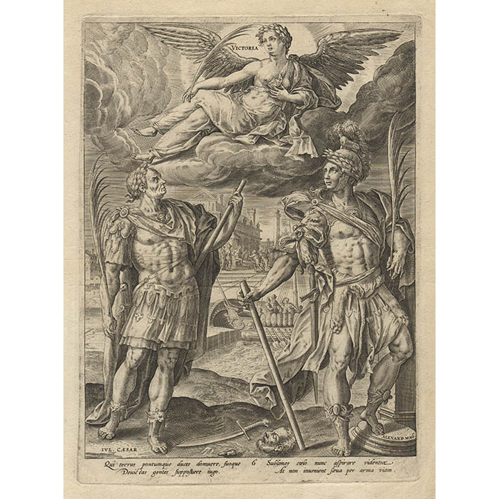 [In Victoria, Plate 6] Julius Caesar and Alexander the Great appear beneath winged Victory, with a warship and soldiers behind. The two great leaders represent martial triumph, while [in Pax, Plate 7] Numa and Solomon serve as exemplars of Peace, personified above as a female figure with a laurel branch in her hand. Through his wisdom Solomon obtained decades of peace for the kingdom of Israel, while Numa, the legendary second king of Rome, secured peace with Rome’s enemies. Behind the two kings stands the Temple of Janus with closed doors, an indication of a time of peace.