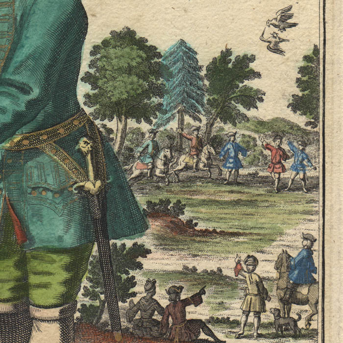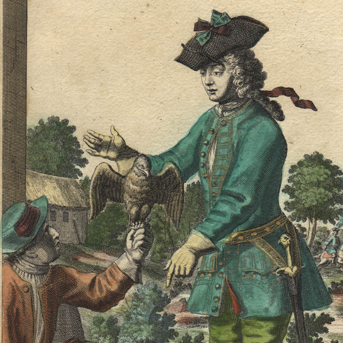 Martin Engelbrecht and his brother Christian were printsellers and engravers in Augsburg, Germany. Martin engraved some plates after Rugendas and other masters. His other works included illustrations for Ovid’s Metamorphoses, The War of Spanish Succession, and P. Decker’s Les Architectes Princiers, as well as other views, including 92 views of Venice. In about 1730, he created cards for miniature theaters depicting religious scenes or genre pictures of daily life that created a dimensional scene in one-point perspective when inserted into a peep box. Notably, he composed and etched a series of prints of workers and their dress, Assemblage Nouveau Des Manouvries Habilles, published at Augsburg, circa 1730. Some of his etchings of tradespeople and sportsmen are documentary or tell a story, with explanatory text or poems. Others are anthropomorphic inasmuch as the tradespeople are dressed by cleverly assembling respective trade objects that resemble clothing. Numerous examples of these are offered by George Glazer Gallery.