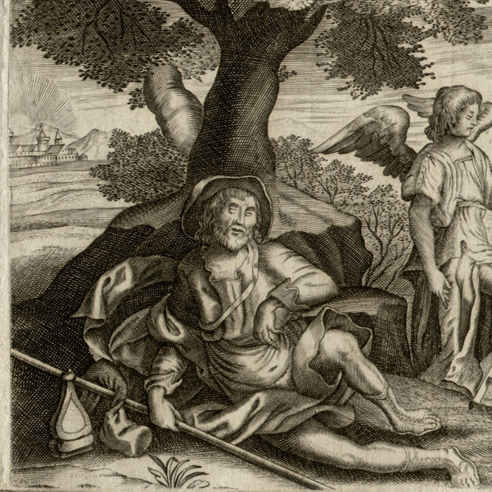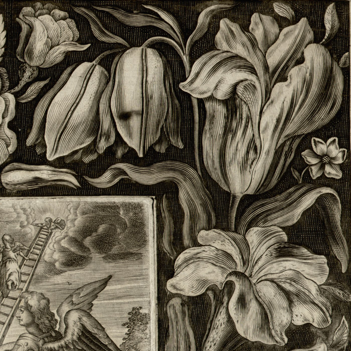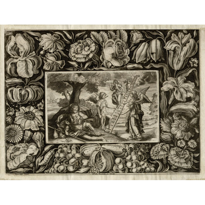The print depicts Jacob’s dream within a lush, separately engraved decorative floral border. The border is a tour de force of Baroque botanical engraving, showing tulips, day lilies, daffodils, carnations, roses, irises, and ripened fruits. The combination of an elaborate floral border by one artist enclosing a smaller biblical scene by another is reminiscent of Medieval manuscript illumination.