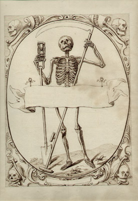 Original design of a skeleton within an oval frame decorated in a baroque style that appears to be a design for an engraving. Head tilted upward as if gazing at the heavens, the skeleton holds the classic allegorical symbols of death: a gravedigger’s shovel and hourglass denoting the passage of time in its right hand, and the grim reaper’s sickle in the other. An empty banner hangs in front of the skeleton, perhaps to have the name of the deceased incorporated during printing. The spandrels each incorporate a skull and bones. Memento Mori was a genre of art incorporating emblems of mortality in order to remind the viewer of the inevitability of death. Such images were engraved on tombstones as early as the fifteenth century. It is possible that this was meant to be personalized as a keepsake after a loved one’s death.