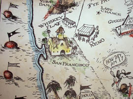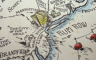 Several versions of this map were published. It originally appeared as a two-page spread in the Washington Post while the artist, Edward McCandlish, was a staff illustrator there. A color version was published c. 1924-1926 as Bill Whiffletree’s Bootlegger’s Map of the United States. The version shown here has some of the same jokes and some similar illustrations to that one, but instead of satirizing the law via stereotypical regional characters, emphasizes puns on the names of states and cities.
