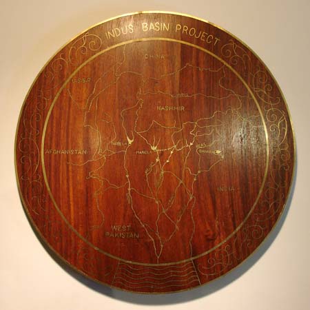 Decorative rosewood plaque with brass inlay of the Indus River Basin region between India and Pakistan where the Indus Basin Project, a water control project, was implemented to benefit Pakistan in the 1960s. The cartography is simple, featuring the Tarbela and Mangla Dams in Pakistan, and the Bhakra Dam in India. National boundaries are indicated with dotted lines and the rivers with straight lines and arrows showing the direction of their flow. The map is set within a curvilinear decorative border, in the traditional Anglo-Indian taste, with the title at the top.