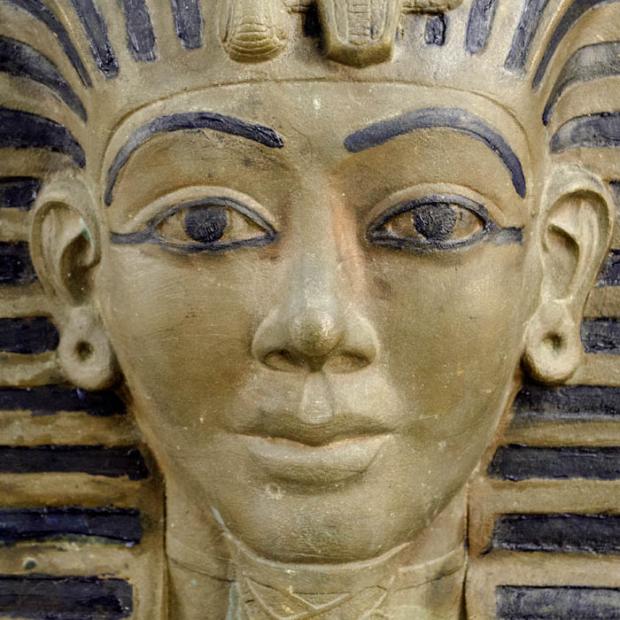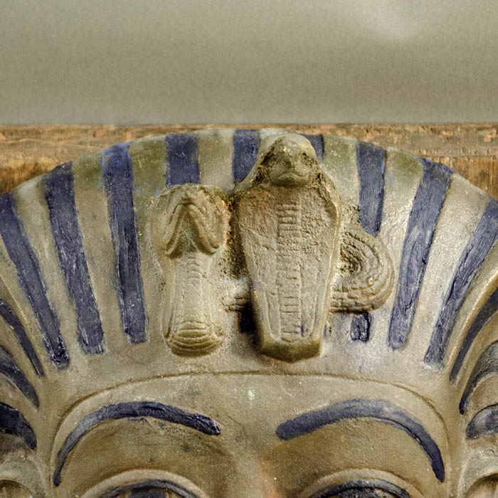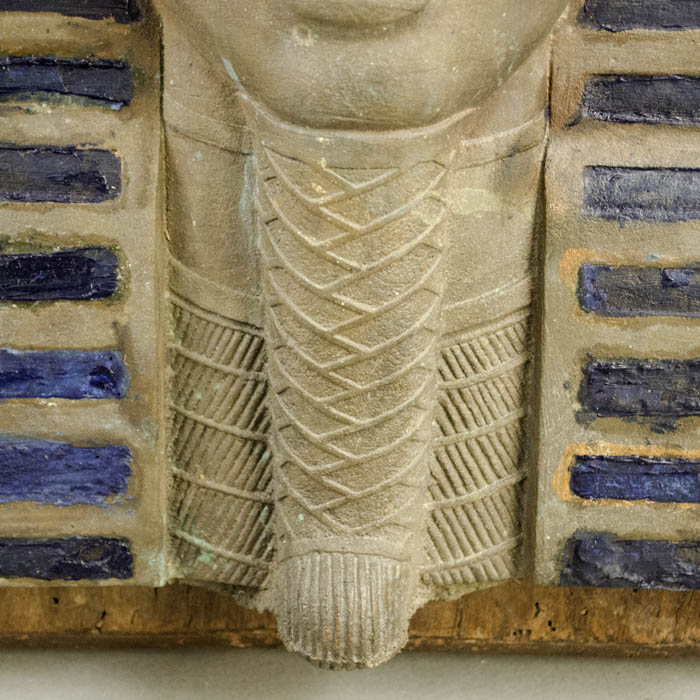 The breathtaking tomb of Tutankhamen captured the imagination of the public when it was initially discovered in late 1922, fueling a revival of interest in Egyptiana in fashion, design, the decorative arts, as well as spurring an interest in the occult. To meet the demand for Egyptian-style art and decorations, a variety of King Tut throne chairs and other objects were produced. This mask was probably made as part of the 1920s “King Tut” craze perhaps as a prototype for an interior architectural installation. Examples of “Tut-mania” were exhibited in 2014 as part of “Discovering Tutankhamun” at the Ashmolean Museum in Oxford, England.